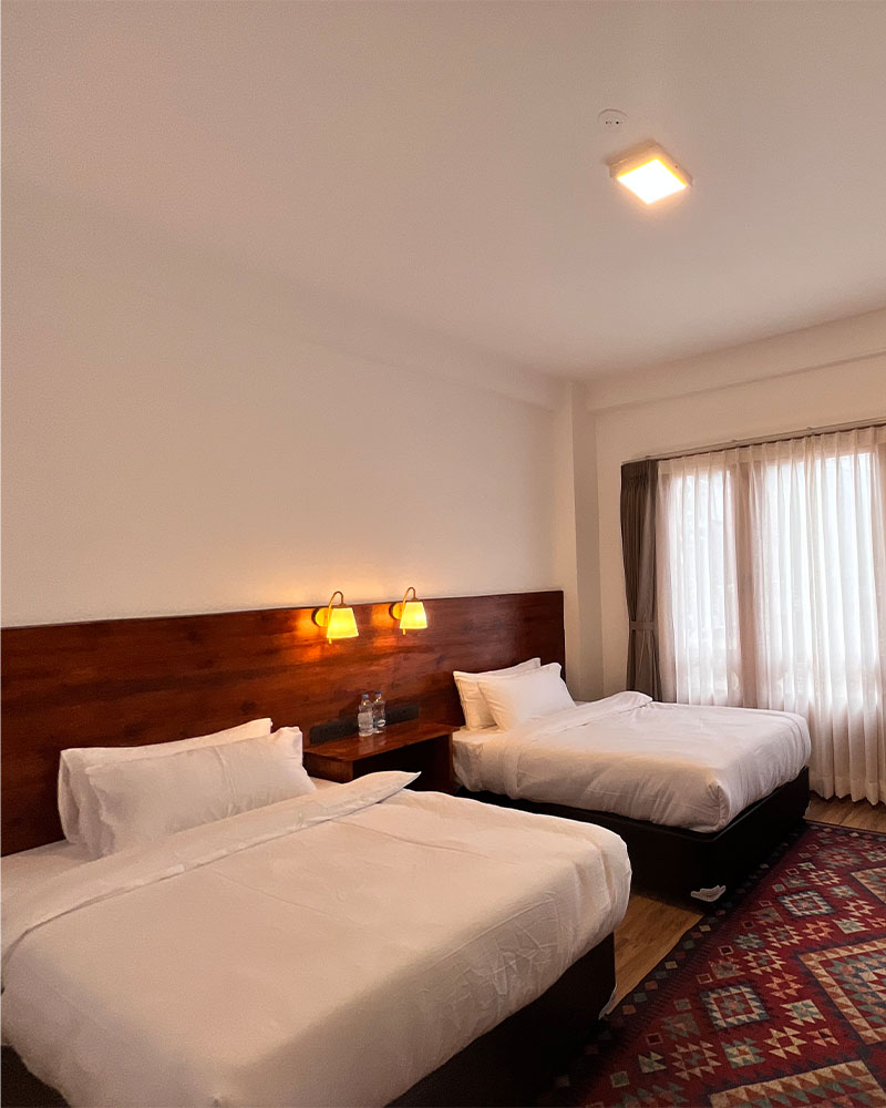 Our 15 front-facing twin rooms with a view of the front courtyard and Khuruthang valley offer a comfortable and convenient stay with two single beds, perfect for friends or families traveling together, providing a restful and private space.